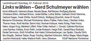 40 Menschen aus Rüsselsheim und Umgebung wollten mit folgender Anzeige im Lokalteil der beiden Rüsselsheimer Zeitungen (Rüsselsheimer Echo und Main-Spitze) ihr Eintreten für die Wahl der Bündnisliste Die Linke/Liste Solidarität bei der Kommunalwahl am Sonntag öffentlich machen.