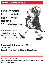 Drei linke Gruppierungen im Kreis Groß-Gerau, die Rüsselsheimer Linke/Liste Solidarität und die Kreisverbände der Parteien Die Linke und DKP haben daher gemeinsam eine offene Arbeitsgruppe "Marx lesen" ins Leben gerufen. Bevor man sich dort in Lesekreisen und Veranstaltungen mit Staat und Ökonomie, Mensch und Natur, Individuum und Gesellschaft beschäftigt, stellt die Arbeitsgruppe am Dienstag, 30.9., die Objekte ihrer Erkenntnisbegierde mit der politisch-literarisch-musikalischen Revue "Ein Gespenst kehrt zurück - Marxismus für das 21. Jahrhundert" vor.