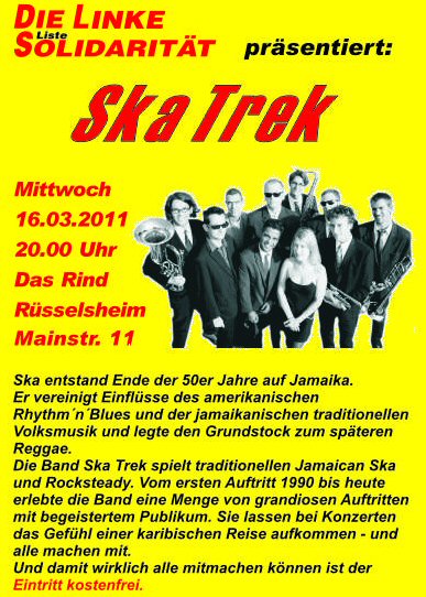 Als kulturellen Höhepunkt ihres Kommunalwahlkampfes sieht die Rüsselsheimer Linke/Liste Solidarität das Konzert der Band Ska Trek am Mittowch abend im Rind.
