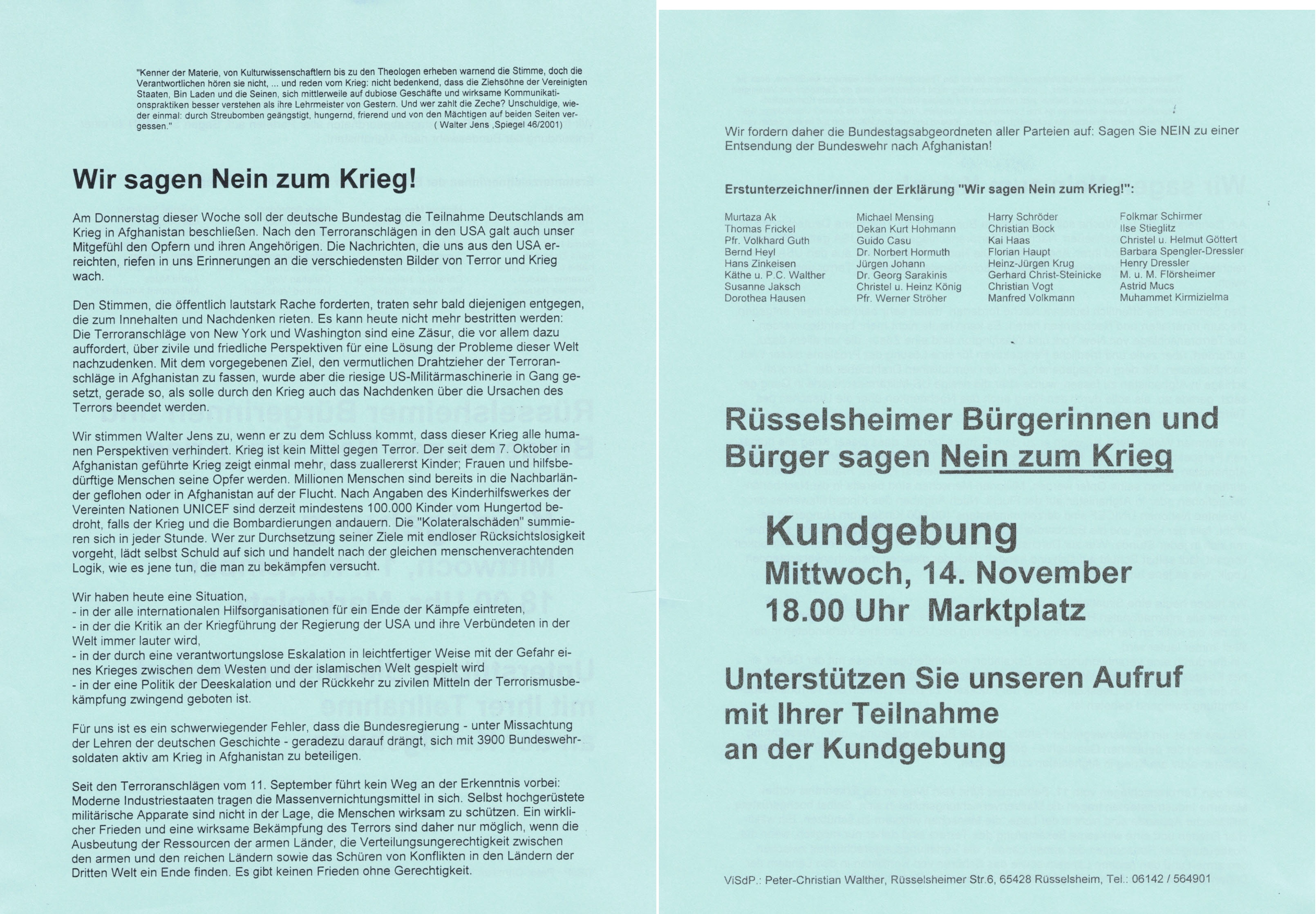 Angesichts der Terroranschläge in Paris, Beirut, Ankara, Suruc, ... und angesichts der Reden vom 3. Weltkrieg, der uns damit jetzt aufgezwungen sei ( übrigens das genaue Gegenteil der Aussagen von Jorge Mario Bergoglio/Papst Franziskus, der im Rahmen seiner Kapitalismuskritik sagte: “Damit das System fortbestehen kann, müssen Kriege geführt werden, wie es die großen Imperien immer getan haben. Einen Dritten Weltkrieg kann man jedoch nicht führen, und so greift man eben zu regionalen Kriegen”) und angesichts der Tatsache, dass diejenigen (die meisten derjenigen), die das behaupten, schon lange die von Papst Franziskus genannten regionalen Kriege (Jugoslawien, Afghanistan, Irak, Libyen, Syrien) befürworten, planen, anfachen, führen, daran profitieren (Bundespräsident Köhler 2010: “ ... auch in der Breite der Gesellschaft zu verstehen, dass ein Land unserer Größe mit dieser Außenhandelsorientierung und damit auch Außenhandels-abhängigkeit auch wissen muss, dass im Zweifel, im Notfall auch militärischer Einsatz notwendig ist, um unsere Interessen zu wahren, ...), habe ich einen 14 Jahre alten Text herausgesucht. Der Aufruf “Wir sagen Nein zum Krieg” für eine Kundgebung in Rüsselsheim am 14.11.2001 entstand zwischen 9/11, den Terroranschlägen auf die Twintowers, und dem Bundestags-beschluss zum Kriegseinsatz der Bundeswehr am 16.11.2001 .